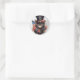 A dignified, long-haired cat gazes forward with calm authority, wearing a vintage top hat adorned with subtle celestial motifs, a red-and-white band, and a brass clock medallion. Soft red and blue roses frame the cat’s face, weaving through its fur in a patriotic floral wreath. A small American flag rises proudly at one side, blending national pride with Victorian elegance. The artwork combines whimsical Americana with refined, storybook charm, evoking both independence and timeless grace.