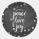 Aproveite este adesivo de feriado com as palavras paz amor e alegria sobrepostas em quadro negro com estrelas decorativas.