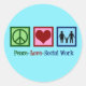 O Trabalho Social Peace Love está presente. Um presente de Natal bonito para assistentes sociais, com uma família de mãos dadas ao lado de um sinal de paz e coração. Um bom design para serviços sociais.