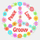 Divirta-se com este design retrô com um sinal de paz feito de flores e as palavras - Peace Love Groovy. Traga de volta os anos 60 e 70.