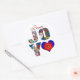 Letras alfabéticas brancas com corações coloridas, design de monograma artístico legal de Natal com pinturas acrílicas originais, Snowman e Papai Noel tocando violino, sax e harpa celta na luz da lua com coruja, noite de inverno nevada, ornamentos florais, plantas de inverno, bagas holly, balões, vermelho brilhante, verde, azul, cores amarelas.