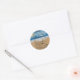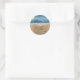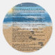 Uma pintura de uma praia com pegadas e pegadas poéticas na areia.