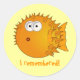 Uma série divertida: Um design de adesivo divertido com um surpreso peixe-pufe de desenho animado. Você pode mudar ou personalizar o ditado/piada engraçado, se quiser. Como planejado, as palavras dizem: ESCREVA! .. você tem uma memória como um peixe
