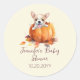 Este adesivo giro e redondo de chá de fraldas apresenta uma ilustração rústica de uma abóbora com um filhote fofo com algumas folhas e folhagem de outono. Personalize com seus detalhes e a data. Perfeito para um chá de fraldas neutro de gênero para um menino ou uma menina durante o outono e a temporada de Ação de Graças.