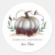 O tema elegante e elegante da abóbora favorece o adesivo com uma abóbora branca com brilho sujo de ouro e flores vermelhas entorpecidas. O texto sob a ilustração diz "Obrigado por vir!" Personalize este produto adicionando o nome do seu filho na parte inferior. Excelente para o aniversário de outono de uma garota.