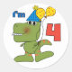 Pequeno Dino 4º Aniversário T-shirts, fatos-chave, cartões, autocolantes, botões de aniversário, sacos de tota, keepsakes, e outros roupa de 4º aniversário do dinossauro e presentes com um dinossauro sorridente verde com balões, chapéu de festa e um presente!