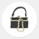 Bolsa de tecido preta com fecho de bola prateada utilizada para conter artigos, incluindo uma cadeia de pérolas