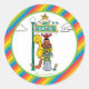 Adicione o toque final perfeito às sacolas da sua festa com este adesivo de favor divertido e colorido da Rua Sésamo! Este rótulo circular apresenta uma cena vibrante dos seus personagens favoritos, incluindo o Grande Pássaro, o Elmo e o Oscar, reunidos pelo icônico poste de sinalização "Rua Sésamo 123". O design é emoldurado por uma borda listrada de arco-íris alegre, dando-lhe um sentimento brilhante e comemorativo. É um acessório essencial para selar sacolas de favor de festa, envelopes ou usar como selos gerais para qualquer festa de aniversário de criança ou evento temático.