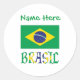 Etiquetas redondas com a bandeira brasileira, com a palavra BRASIL, nas cores da bandeira. Brasil significa Brasil em português. Personalize com um nome, em letras verdes, acima da bandeira. Legal para usar numa reunião familiar. Coisa divertida.