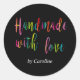 Colorido texto escrito "Mão feita com amor" num fundo preto. Personalize-o com seu próprio nome clicando no botão personalizar.