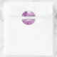 Um adesivo clássico colorido, redondo, desenhado com dahlias roxas estilizadas, colorido em lindos tons de roxo, com pétalas esboçadas em branco. "Saudações de" seu nome leva dentro de palco do centro de um retângulo de bloco de cor branca esboçado em preto. O texto é definido usando a fonte de lavanda dinâmica para adicionar um toque pessoal elegante.