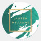 Pinceladas de tinta verde esmeralda escura criam um fundo abstrato neste design de adesivo personalizado. Seu nome ou nome comercial é exibido em uma caixa de ouro falso para uma estética moderna. Esses adesivos são ótimos para usar no fechamento de envelopes ou pacotes, para usar em rótulos de produtos ou velas, ou para personalizar suprimentos de escritório. Arte e design © 1201AM Design Studio | www.1201am.com