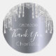 Um chá de noiva moderno e glamoroso. Um fundo de metal prateado falso com aparência de folha de alumínio decorado com pingos de brilho de prata falsos, com efeito de tinta pingando. Personalize e adicione uma data e nome. O texto: Obrigado é escrito com uma fonte moderna de letra manuscrita. Perfeito para lembrancinhas e cartões de agradecimento.