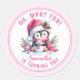 Crie autocolantes personalizados únicos para a festa de aniversário da primeira menina no tema "Oh, Que Divertido". Estas etiquetas redondas, de cor rosa e branca, apresentam um pinguim giro e giro num chapéu e cachecol de Papai Noel, sentado com um boneco de neve rodeado de verde e ornamentos de férias. O modelo torna fácil digitar o nome da aniversariante, que é projetado em uma fonte casual de script.