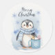 Uma ilustração encantadora de inverno de um adorável pinguim vestindo um chapéu e cachecol listrados, trazendo uma vibração acolhedora e festiva. Os flocos de neve suaves e tons azuis suaves no fundo criam uma atmosfera mágica de inverno. Perfeito para cartões de Natal, posters, adesivos e artesanatos sazonais!
