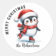 Crie autocolantes personalizados únicos de Natal para selantes de envelopes, favores ou invólucros de presentes com um design que diz "Feliz Natal" e apresenta um pinguim fofo em chapéu vermelho de Papai Noel, cachecol e skates de figuras. O modelo torna fácil digitar o nome da sua família na fonte de script casual.