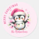 Crie adesivos de Natal rosa personalizados exclusivos para selos de envelope, lembrancinhas ou embrulhos de presente com um design que diz "Feliz Natal" e apresenta um pinguim fofo de chapéu de Papai Noel rosa segurando luzes de Natal. O modelo facilita a digitação do nome da sua família em fonte de letra cursiva casual.