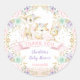 Um adorável adesivo redondo, com tema florestal, que inclui um grupo de adoráveis bebês e um arranjo floral elegante de cor aquosa a rosa, púrpura, menta e ouro. Itens correspondentes disponíveis em nossa loja!