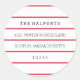 Adesivo de endereço de retorno redondo com um design mínimo de riscas largas em vermelho e branco, com letra preta.