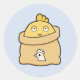 Um frango amarelo entediado sentado em um saco de alimentação. Preso? Sim. Preocupada? Na verdade não.