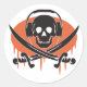 O design Pirate DJ apresenta crânio com fones de ouvido e espadas cruzadas sobre tinta laranja pingando. Dedicado aos DJs piratas que mantêm a música viva.