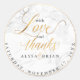 PixDezines faux gold Love & obrigado adesivos com monogramas de caligrafia DIY em dourado falso sobre o mármore branco (amovível). Copyright © 2017 PixDezines.com™ e PixDezines™ em zazzle.com. Todos os direitos reservados.