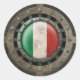 Este gráfico único mostra a bandeira da Itália que marcou dentro de uma estrutura metálica circular. A bandeira italiana tem a aparência de estar debaixo de um vidro com um reflexo luminoso visível no topo da design. A bandeira tem uma textura áspera adicionada que contrasta o acabamento liso da armação de aço inoxidável. Grandes rebites aparecem na estrutura circular, o que dá ao padrão uma forte aparência industrial. As chapas de aço envelhecidas são visíveis fora da armação, com uma malha de aço a aparecer atrás. Este design industrial tem uma sensação de galo e é uma na moda para mostrar seu patriotismo.