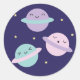 Planetas bonitos com rostos kawaii e minúsculas estrelas no espaço. Colores de Pastel em um fundo azul escuro.
