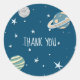 Adesivos fofos de agradecimento com tema de galáxia. A imagem mostra alguns planetas e estrelas azuis. A ilustração parece ser tridimensional, mas é apenas uma impressão. Ilustrado e projetado por Patricia Alvarez.