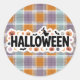 A cute and playful Halloween sticker with orange and purple plaid, pumpkins, bats, and witch hat. Great for gifts, décor, and party favors.