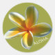 Uma flor de plumeria amarela com Aloha em um adesivo.