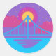 Uma ponte brilhando em tons de rosa vermelho contra um sonhador céu noturno roxo, uma lua de cheio luminosa brilha atrás de nuvens de deriva enquanto seu reflexo brilha através da água calma abaixo.