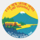 Etiqueta de poster de viagens para o Fiji Grand Hotel, que apresenta o hotel no lago com montanhas com cobertura de neve no fundo.