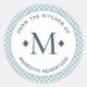 Presente de Comida caseiro da cozinha do Monograma Clássico de Gingham Teal, Comida ou etiqueta de tampa... Um padrão de verificação de gingham lacrimejado borda o texto do seu produto de comida caseiro nestas etiquetas adesivas redondas coloridas para dar os seus doces caseiros, cookies, tartes, pães e muito mais. No centro do rótulo estão duas formas de diamante que fazem fronteira com o seu monograma inicial. Você pode revisar todo o texto de acordo com suas próprias necessidades no modelo de personalização prático.