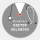 Cartazes de doação para médicos criativos, etiquetas partidárias ou selos de envelopes com esfregões hospitalares de cinza únicos e estetoscópio. Para personalizar o texto de edição para adicionar o nome do médico.