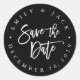 Chic, preto e branco moderno salve os adesivos de data em seus nomes e data de casamento em texto circular em volta de "salve a data" em tipografia de pincel com letra branca. Uma maneira impressionante e elegante de terminar sua gravação de data mails em preto e branco eterno.