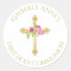 Envie seus primeiros convites de comunhão em estilo com esses adesivos elegantes de envelope de nome monograma. Este design apresenta uma simples cruz de ouro no centro com um buquê de rosas cor-de-rosa no centro. Tem o nome das suas filhas acima do qual pode ser personalizado e os mundos "Primeira Comunhão" abaixo. Desenhado pela artista ©Susan Coffey.