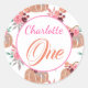 Um clássico adesivo circular clássico de 1º aniversário com seu nome personalizado em um bonito roteiro cor-de-rosa e a palavra "Um" em um guião laranja elegante. Você pode adicionar facilmente o nome de sua escolha e alterar a cor e a fonte usando a opção personalizar!