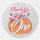 Um adesivo clássico de 1º aniversário de outono bonito com uma grande abóbora floral laranja e brilho prateado brilha no fundo. A palavra "Um" está em um grande script branco elegante, e seu nome personalizado está em um bonito script rosa-quente. Você pode adicionar facilmente o nome de sua escolha e alterar a cor e a fonte usando a opção personalizar!