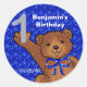 Ursinho de pelúcia castanho, bonito, dançando arcos azuis em luzes azuis, são adesivos divertidos, redondos ao primeiro aniversario, que podem ser usados como adesivos para livros de rasparia com papéis semelhantes disponíveis na minha loja. Personalize o nome e a data usando o modelo fornecido.
