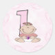 Adorável bebê segurando um presente só para ela. Fundo rosa de rolagem com um grande número um!