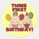 Os gêmeos fazem o primeiro aniversário de T-shirts, fatos-chave, autocolantes, cartões, posters, guardas e mais gêmeos nos chapéus e balões de festa e texto que diz "Gêmeos Primeiro Aniversário!".