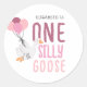 Este adesivo de aniversário "Um Bobo Ganso" apresenta um ganso divertido flutuando com balões cor-de-rosa contra um fundo branco limpo. É uma maneira doce e leve de adicionar um toque pessoal para favorecer bolsas, envelopes ou decoração de festas para o seu primeiro aniversário. Perfeito para um bobo ganha festa temática com tons cor-de-rosa suave e charme caprichoso.