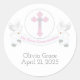 Um adesivo adorável para a Primeira Comunhão de uma garota com duas pombas brancas segurando uma faixa com texto lendo "Minha Primeira Comunhão" e uma cruz rosa e cinza. Personalizar para convites, sacos de presentes favoritos de festas ou muitos outros usos. (Alguns gráficos AMBilustrações ©2017)