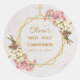Este elegante adesivo geométrico de primeira comunhão, geométrico, floral, recomendado para um primeiro convite à comunhão, tem uma estrutura de ouro irregular, com buquês de flores de orquídeas brancas e cor-de-rosa para cima, para a direita e para baixo, sobre dois hexágonos de ouro que se sobrepõem a um fundo mármore branco, com uma cruz de ouro no topo. O nome da criança é escrito em um roteiro caligráfico elegante. Todo texto tem uma cor amarela ouro, como o quadro dourado. O buquê de flores com orquídeas cor-de-rosa e brancas é de um cartão postal antigo de Bertha Maguire (1862-1910), agora no dominio público.