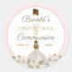 O espantoso primeiro adesivo da Santa Comunhão com elementos florais e verdes rústicos com uma menina de vestido branco tradicional, contra um fundo cor-de-rosa pincelado e suave. Clique em personalizar para adicionar seu próprio texto.