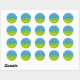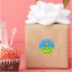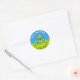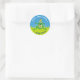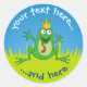 Cartoon Príncipe sapo com coroa sobre grama verde sob céu azul. Dois campos de texto personalizados em círculo.