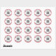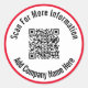 Uma imagem de exibição está no meio do adesivo. Você pode substituí-lo pelo seu código QR. Há duas linhas de texto de exibição em preto que você pode editar para mostrar uma mensagem personalizada. Estes autocolantes têm texto preto num círculo branco. O adesivo tem uma borda vermelha.