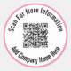 Uma imagem de exibição está no meio do adesivo. Você pode substituí-lo pelo seu código QR. Há duas linhas de texto de exibição em preto que você pode editar para mostrar uma mensagem personalizada. Estes autocolantes têm texto preto num círculo branco. O adesivo tem uma borda rosa.