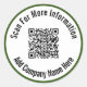 Uma imagem de exibição está no meio do adesivo. Você pode substituí-lo pelo seu código QR. Há duas linhas de texto de exibição em preto que você pode editar para mostrar uma mensagem personalizada. (Mostrado: Verifique se há mais informações e adicione o nome da empresa aqui) Esses adesivos têm texto preto em um círculo branco. O adesivo tem uma borda verde da floresta.